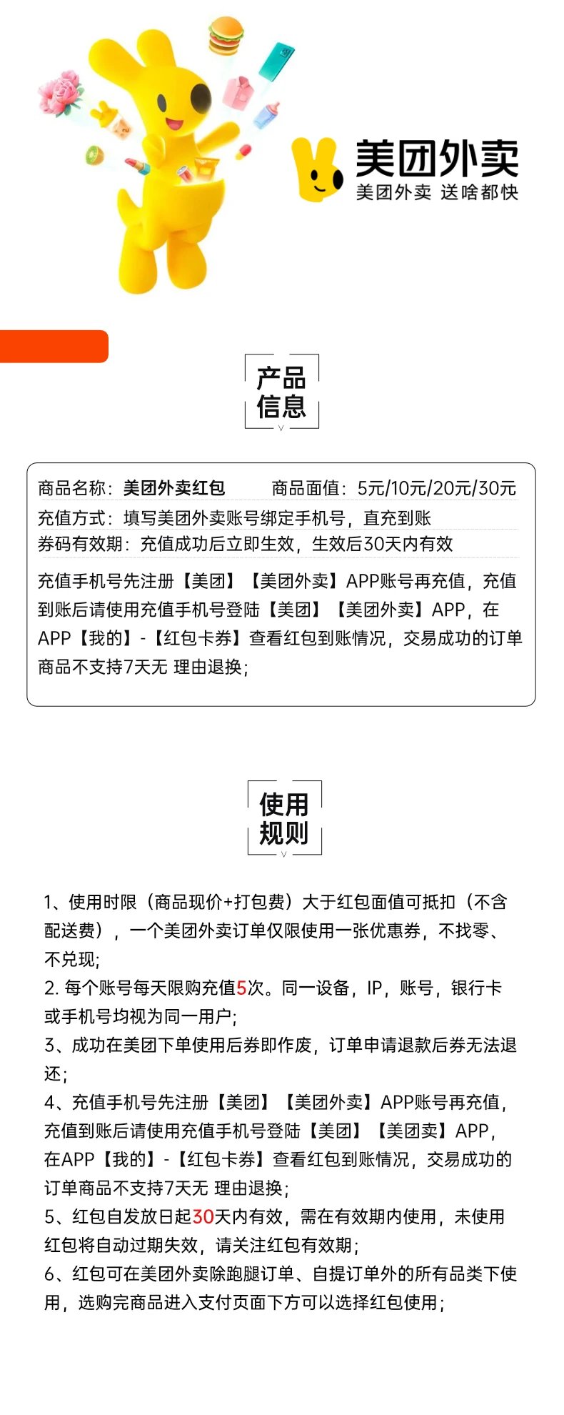 【账号直充】美团外卖30元通用红包丨接口直充丨立即到账丨24小时全天秒单!